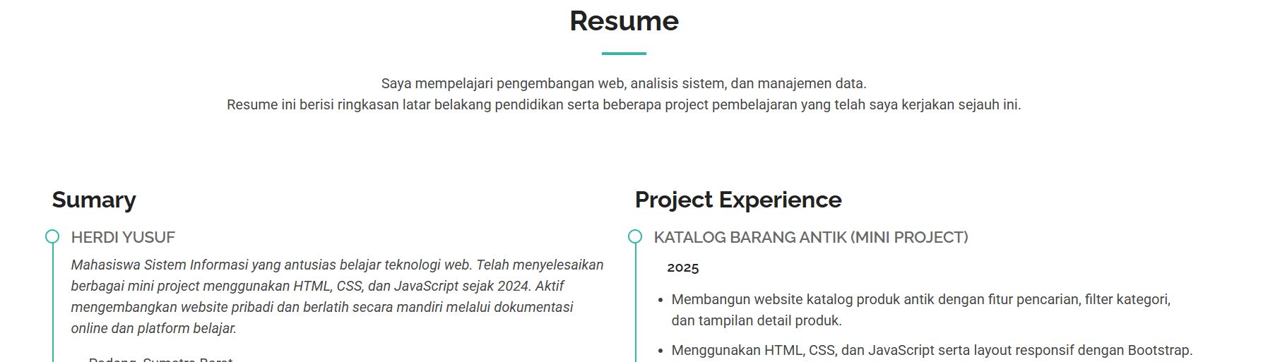 Website ini berfungsi sebagai CV atau portofolio online yang menampilkan biodata pribadi secara profesional. Cocok untuk keperluan melamar kerja, personal branding, atau profil akademik.